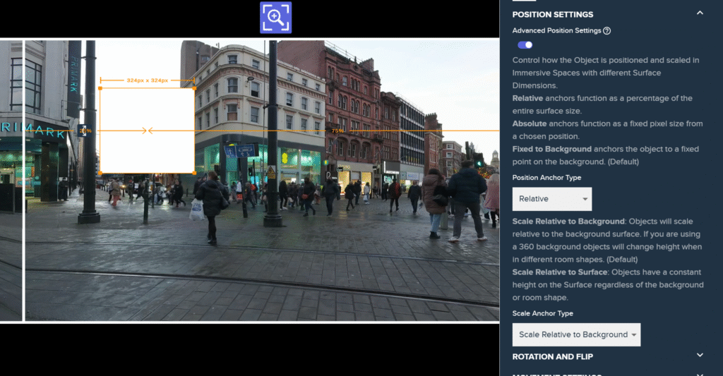 Relative Positioning will position the Media Draggable a specific percentage across the wall regardless of surface width.